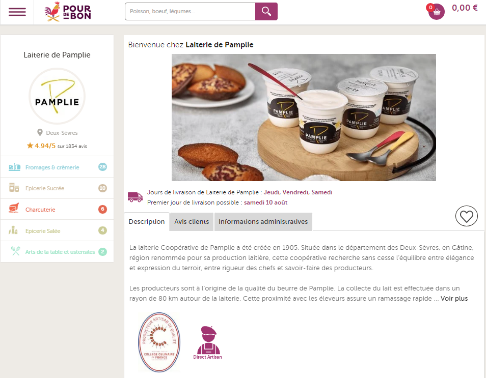 Tous les produits de la gamme Pamplie sont proposés : beurres, fromages, crèmes, yaourts, fromage blanc, lait